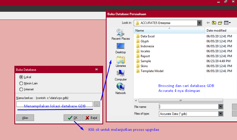 Jika pembelian dan registrasi accurate juga sudah berhasil. kita cukup upgrade database accurate nya saja. Pengertiannya adalah kita bisa melanjutkan database accurate 4 supaya bisa di lanjutkan di accurate 5. Tanpa perlu membuat database baru dari awal lagi, Proses untuk upgrade databasenya sebagai berikut :