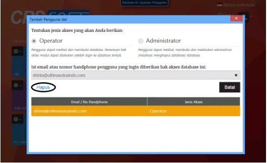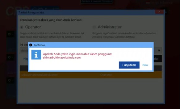 4. Nantinya Pada saat klik Hapus, akan ada konfirmasi “Apakah Anda yakin ingin mencabut akses terhadap pengguna tsb“. Jika Anda sudah yakin, maka klik Lanjutkan.