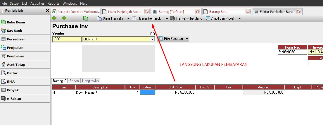 Nantinya di accurate tetap lakukan pembelian kembali melalui faktur pembelian, tujuannya adalah untuk memotong nilai deposit kita sebelumnya.