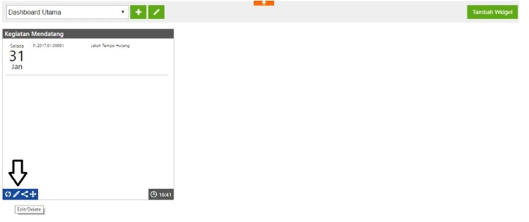 4. Setelah tampil Widget Kegiatan Mendatang, klik Edit/Delete untuk mengatur setting periode waktu yang akan ditampilkan pada widget tsb.
