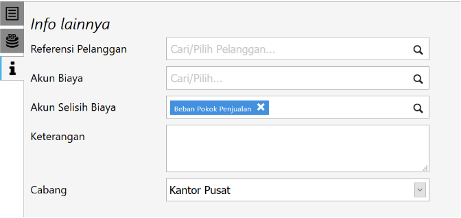 Isi Referensi Pelanggan (jika pekerjaan ini pesanan dari pelanggan), akun biaya, akun selisih biaya, keterangan dan cabang jika ada.