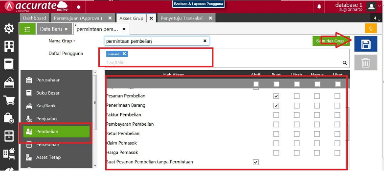 2. Memberikan hak kepada bagian produksi untuk dapat membuat permintaan pembelian dan penerimaan barang melalui fitur Akses Grup yang ada di menu Pengaturan. Centang pada bagian yang Anda anggap perlu dilakukan karyawan Anda. Disini sebagai contoh nama karyawan adalah ‘Sumardi’