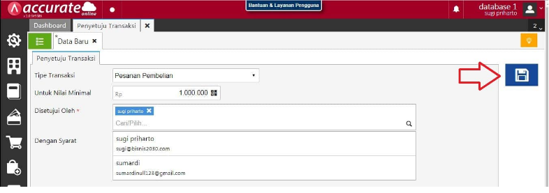 3. Membuat pengguna yang berhak mengotorisasi permintaan pembelian dari bagian produksi melalui fitur Penyetuju Transaksi yang berada di menu Pengaturan, lalu klik simpan.