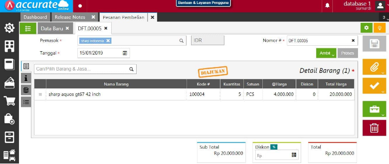 4. Sumardi (karyawan Anda) dapat membuat permintaan pembelian melalui login yang telah dimiliki, kemudian pada saat klik Simpan, pilih Ajukan Persetujuan. Sehingga hasil dari transaksi tersebut seperti pada gambar di bawah ini.
